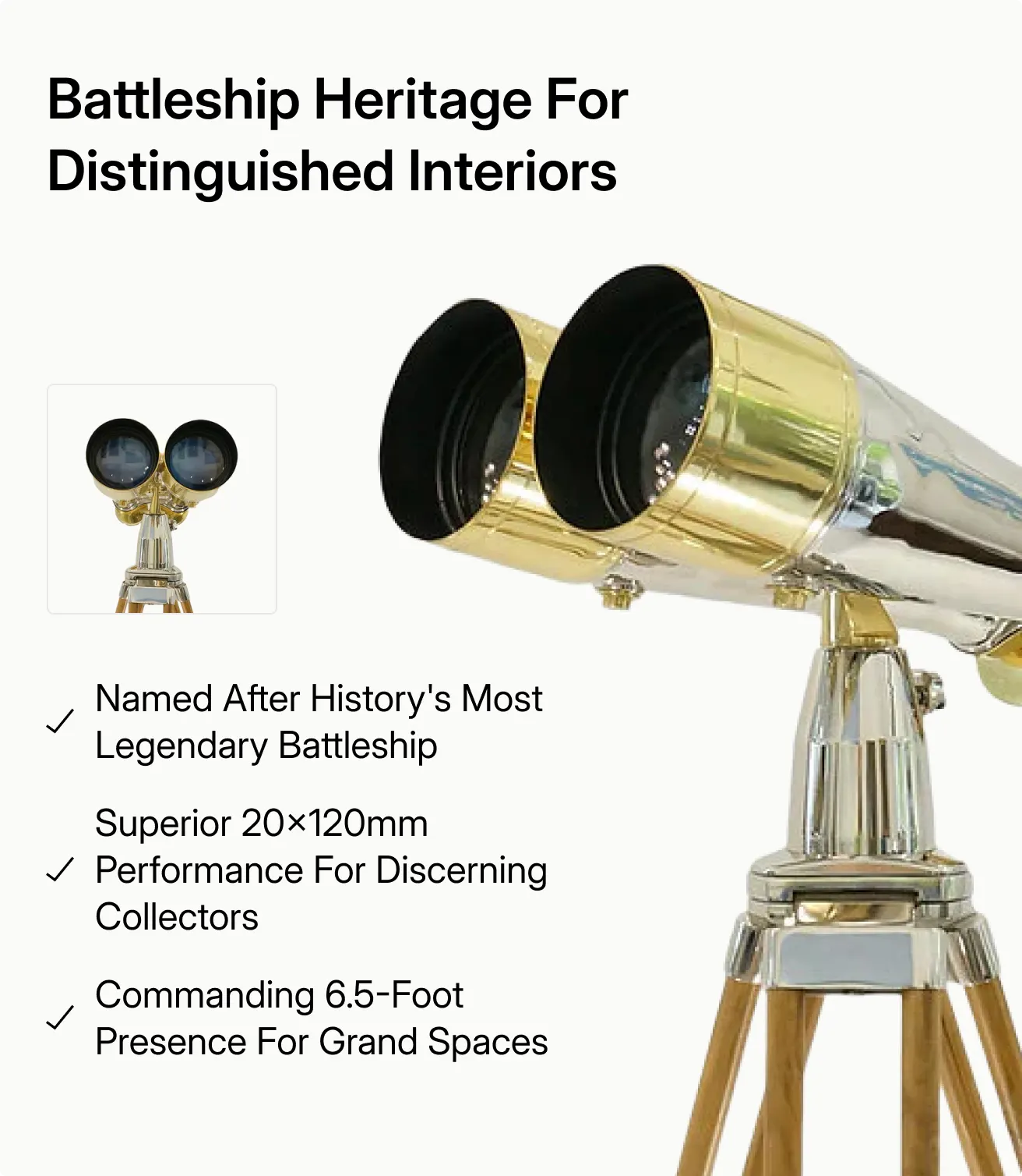 Named after the legendary battleship. This 20x120mm reproduction delivers exceptional optical performance and commanding physical presence – standing nearly 6.5 feet tall at full extension. Designed for grand spaces where superior magnification and substantial scale are essential: penthouse libraries, yacht captain's quarters, luxury resort lobbies, and distinguished private collections. Includes complete historical documentation and LuxxOptica authentication.